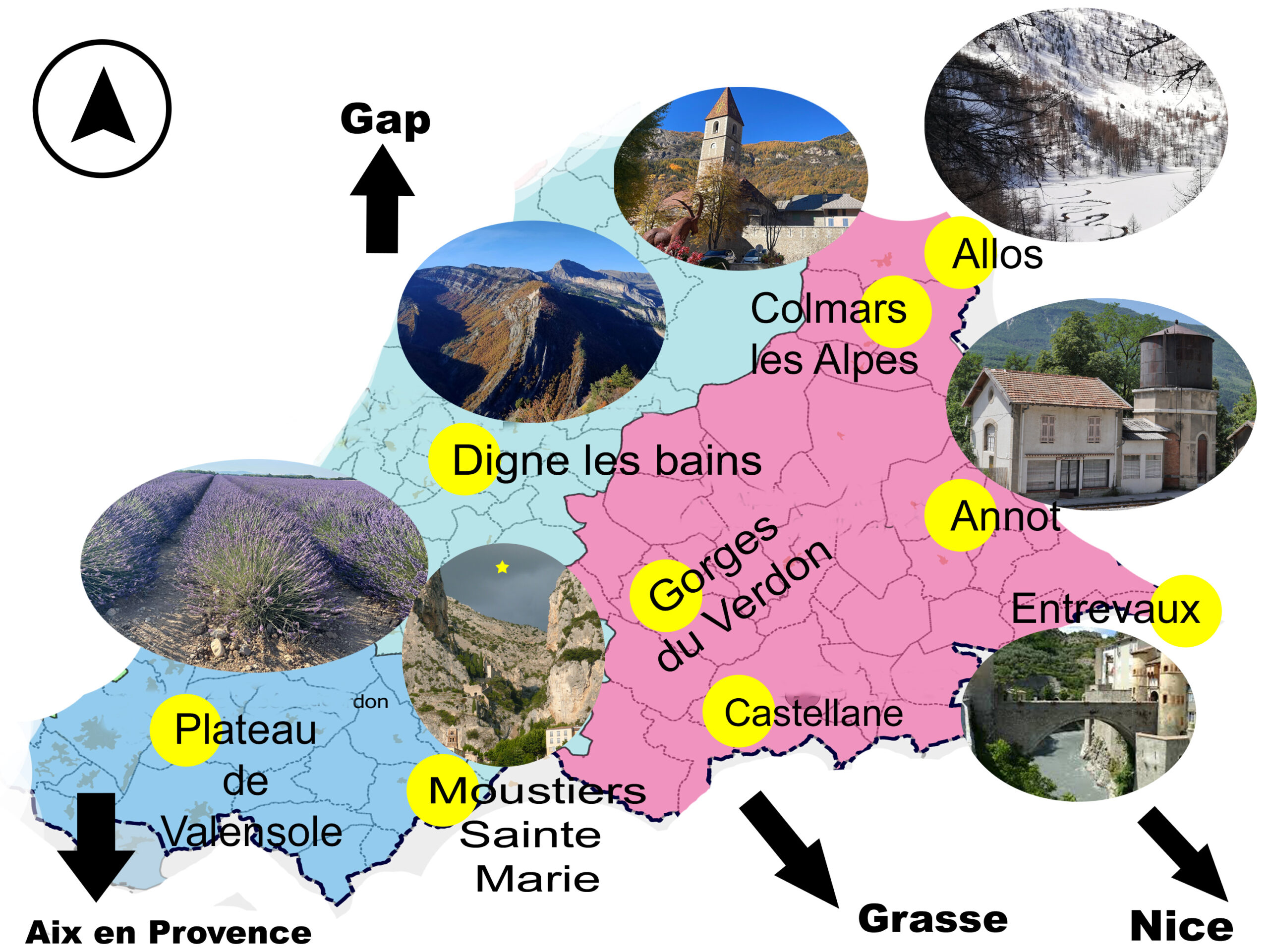 Castellane, Moustiers Sainte Marie, Digne les Bains, Annot, Entrevaux, Colmars les Alpes, Allos, Plateau de Valensole.